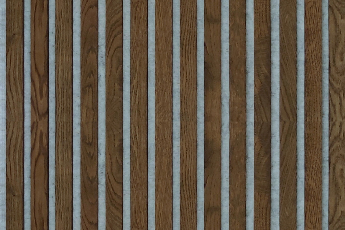 tvorí zvukovo absorbčný PET akustický panel a dubové drevené lamely s funkciou difúzie zvuku
