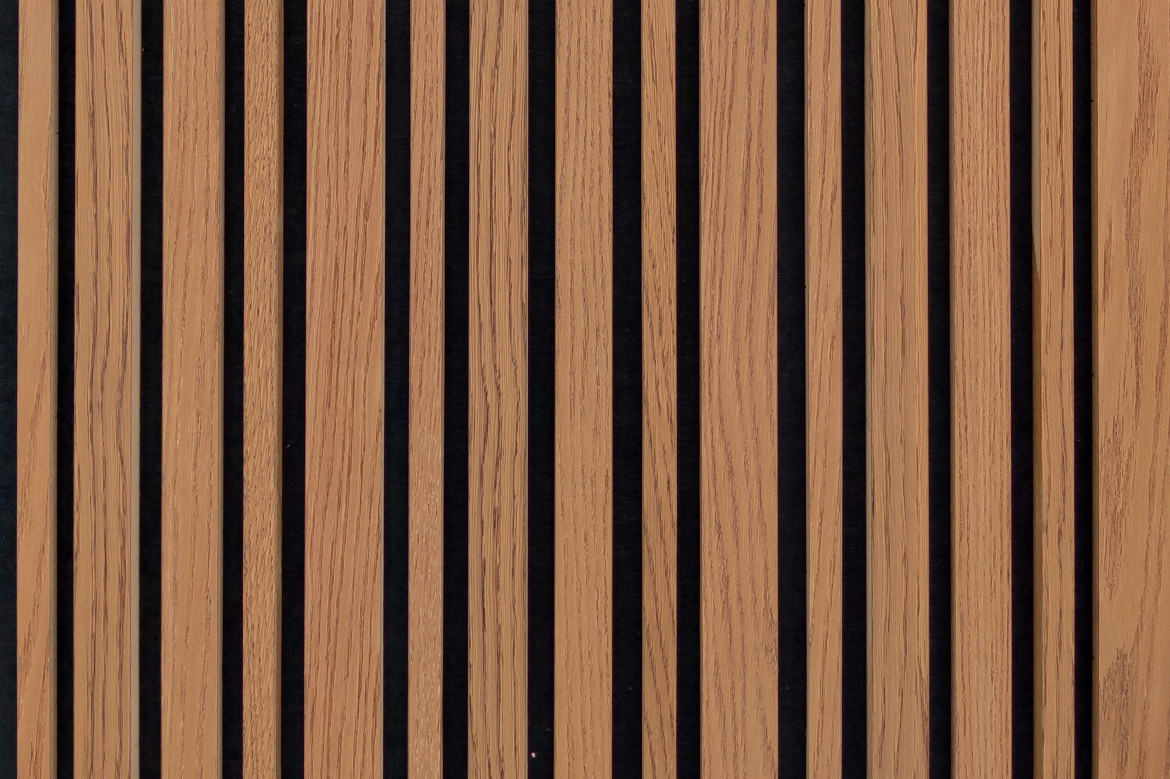 tvorí zvukovo absorbčný PET akustický panel a dubové drevené lamely s funkciou difúzie zvuku