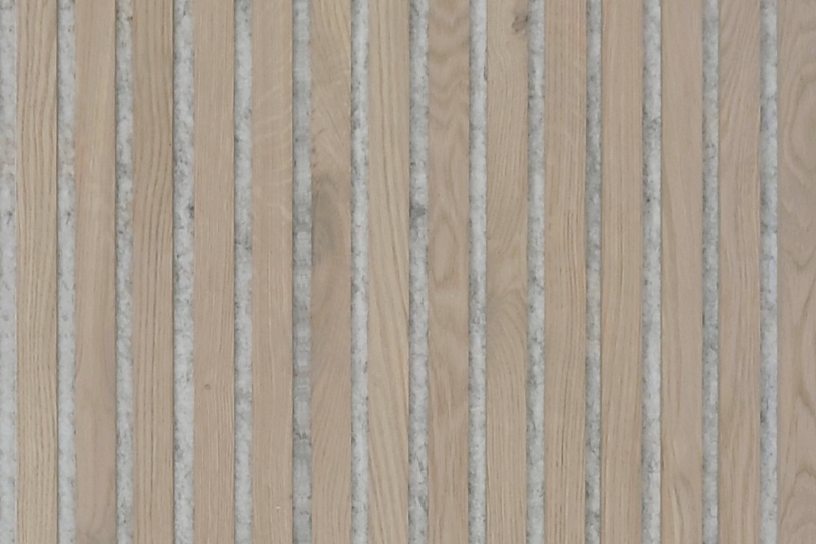 tvorí zvukovo absorbčný PET akustický panel a dubové drevené lamely s funkciou difúzie zvuku