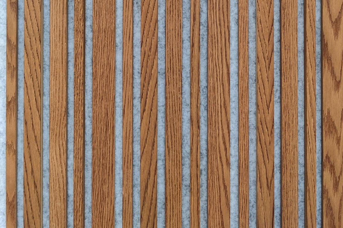 tvorí zvukovo absorbčný PET akustický panel a dubové drevené lamely s funkciou difúzie zvuku