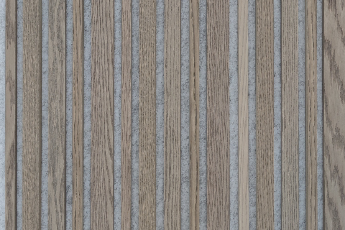 tvorí zvukovo absorbčný PET akustický panel a dubové drevené lamely s funkciou difúzie zvuku