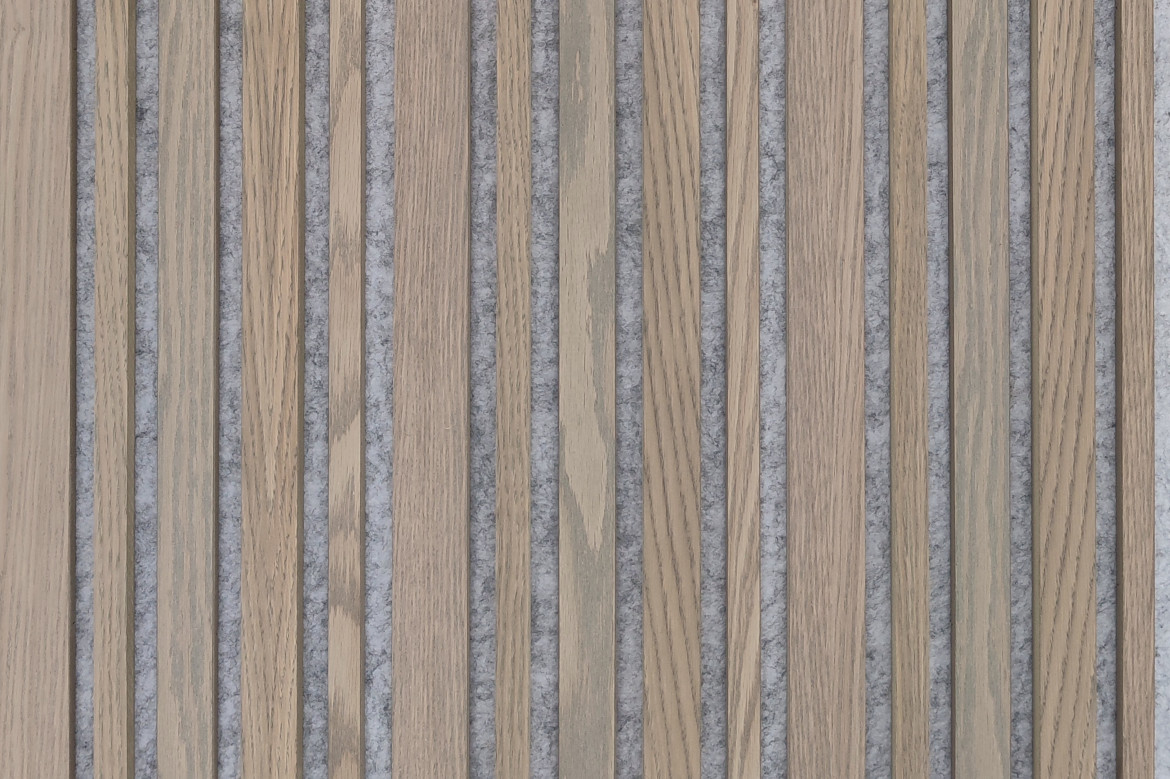 tvorí zvukovo absorbčný PET akustický panel a dubové drevené lamely s funkciou difúzie zvuku