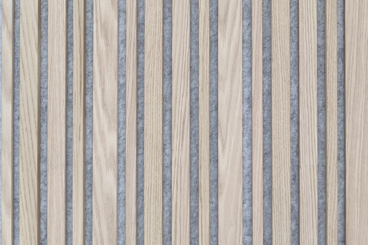 tvorí zvukovo absorbčný PET akustický panel a dubové drevené lamely s funkciou difúzie zvuku